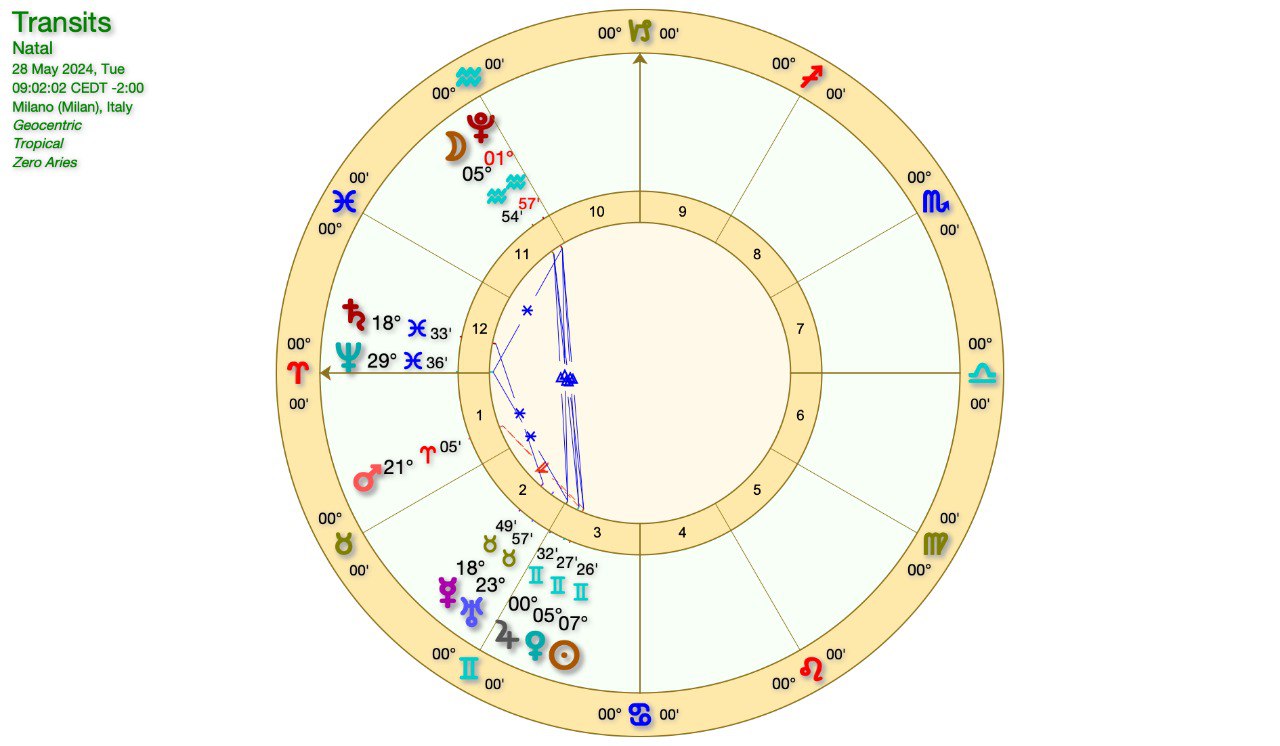 La LUNA sta transitando in PESCI, nell’orbita della CONGIUNZIONE con SATURNO e NETTUNO, MARTE è in ARIETE, e MERCURIO è in CONGIUNZIONE a URANO in TORO.