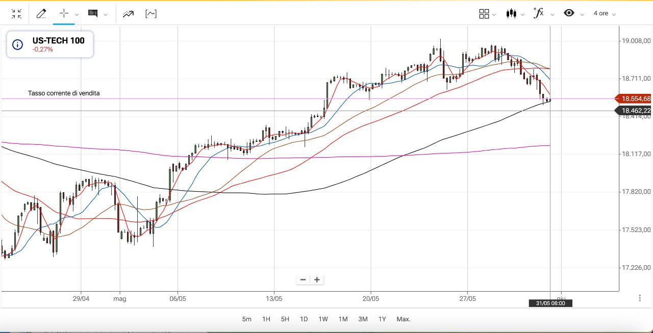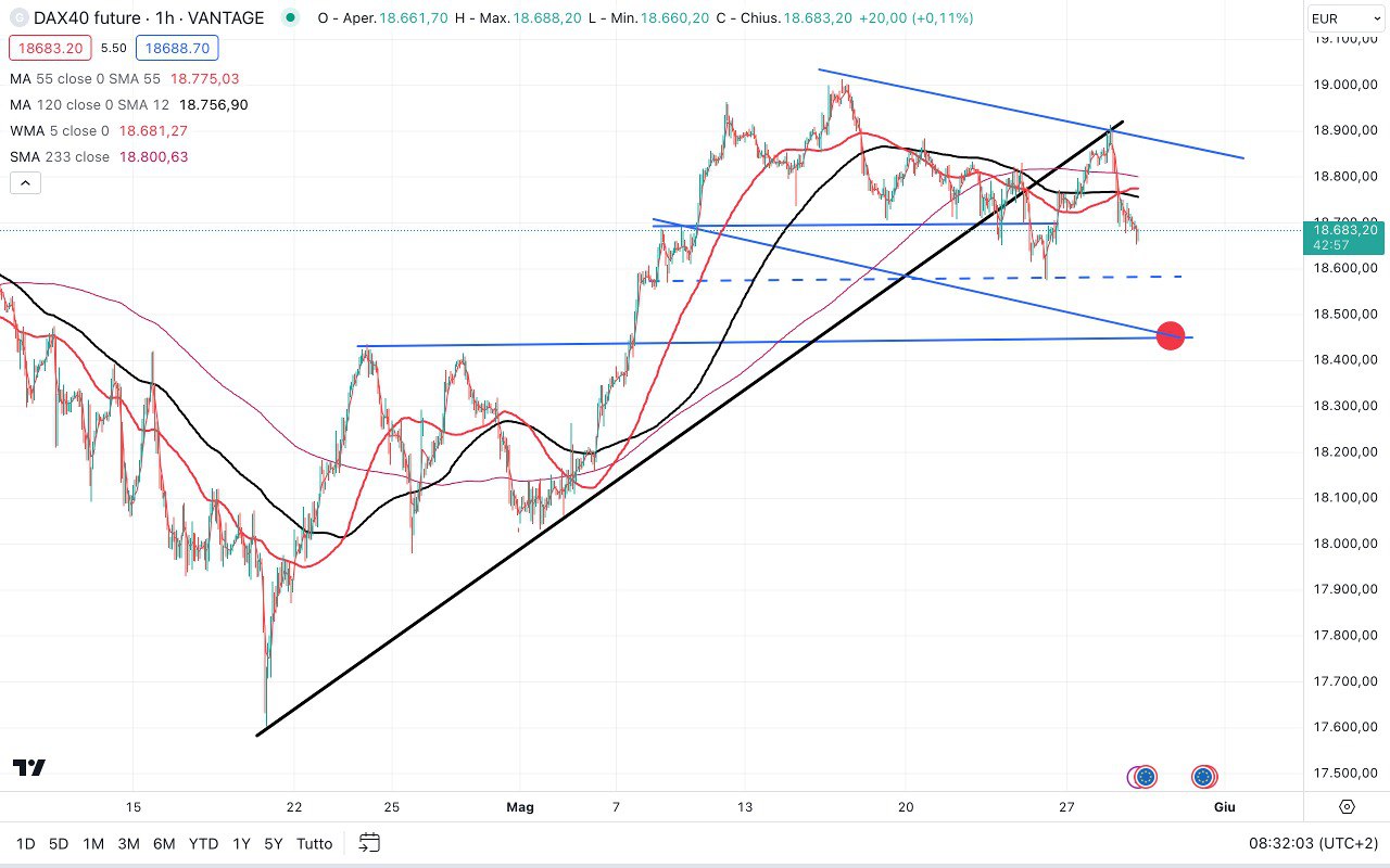 Nel grafico vediamo il DAX, sceso dai massimi di ieri mattina poco sopra i 18900 punti agli attuali 18670-18680 punti circa.