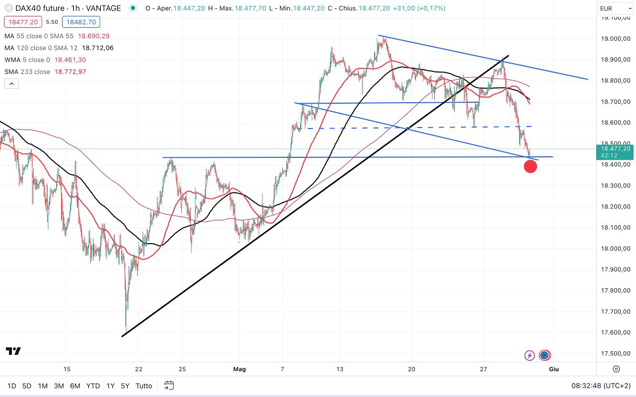 Il DAX sembrerebbe aver raggiunto perfettamente il TARGET al RIBASSO che si trovava tra i 18400 e i 18500 punti.