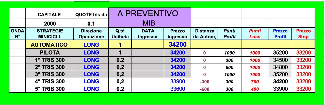 Abbiamo quindi le nuove GRIGLIE su MIB e DAX, con i valori di riferimento a 34200 di MIB e 18500 di DAX.