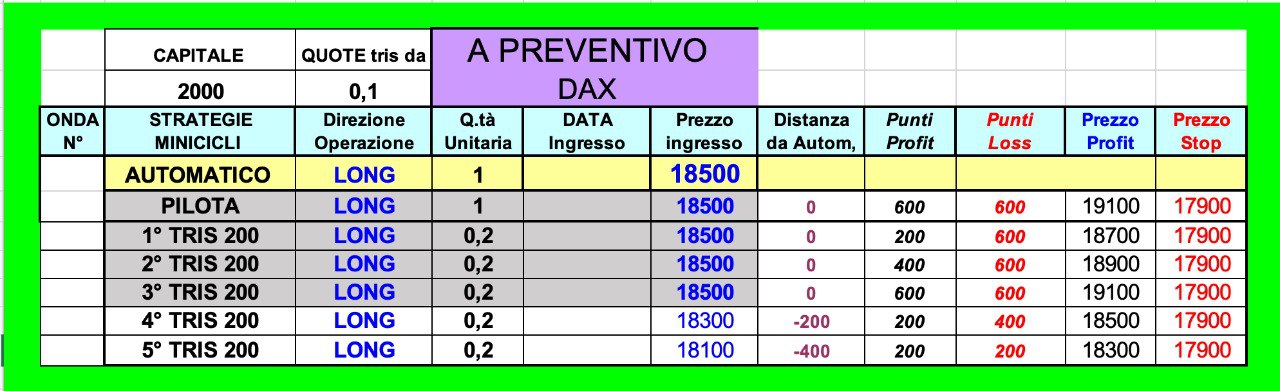 La POSIZIONE è tendenzialmente FLAT visto che l’ONDA è al RIALZO e si potrebbe ipotizzare un REINGRESSO in direzione dell’ONDA stessa qualora si raggiungessero quegli obiettivi ipotizzati nell’analisi, vale a dire i 18400-18450 punti di DAX future.