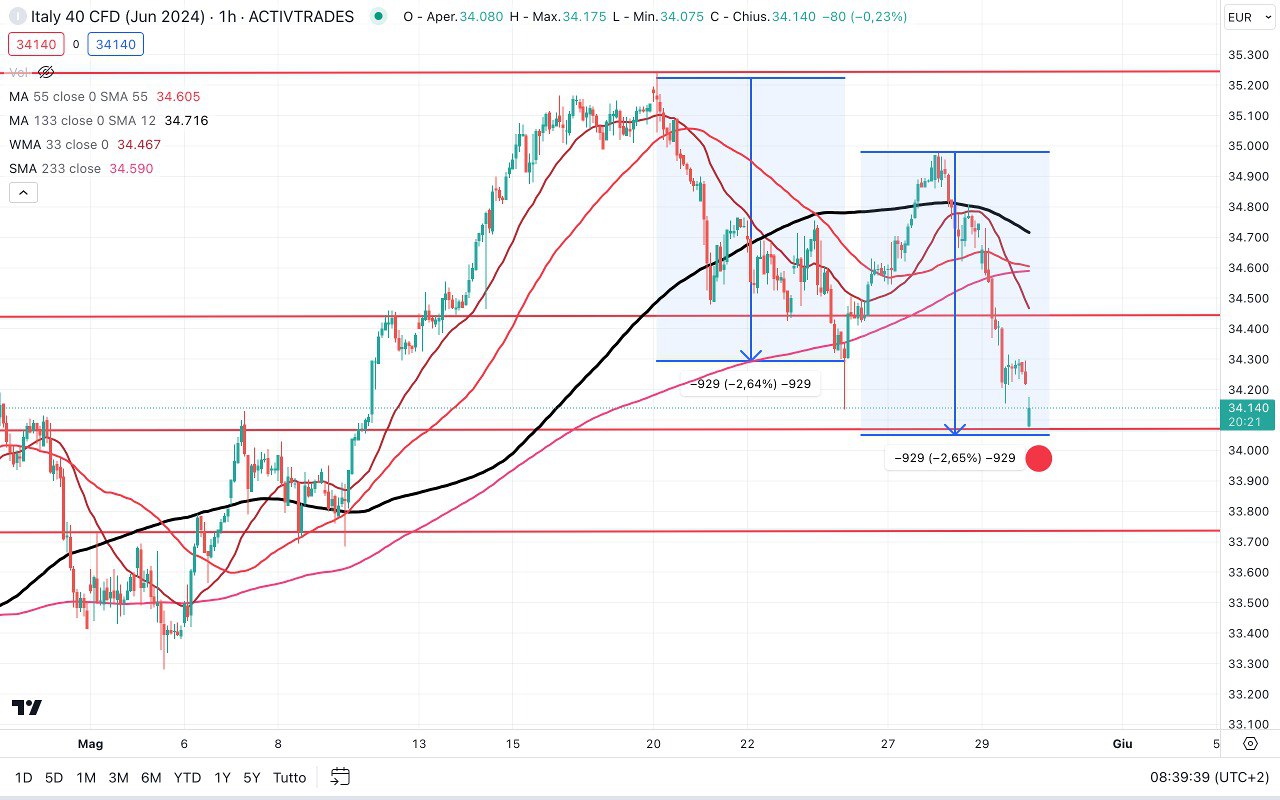 Nell’ultimo movimento, dai massimi di Martedì mattina (34950) il MIB si trova adesso a 34150 punti e ha percorso 900 punti, ma non è escluso che possa avere un’estensione di altri 100-200 punti.