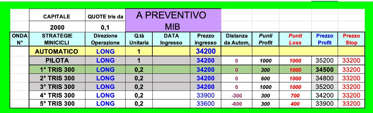 Ciò ha permesso il TAKE PROFIT della QUARTA QUOTA LONG sul MIB, da 34250 a 34550 punti (+300 punti).