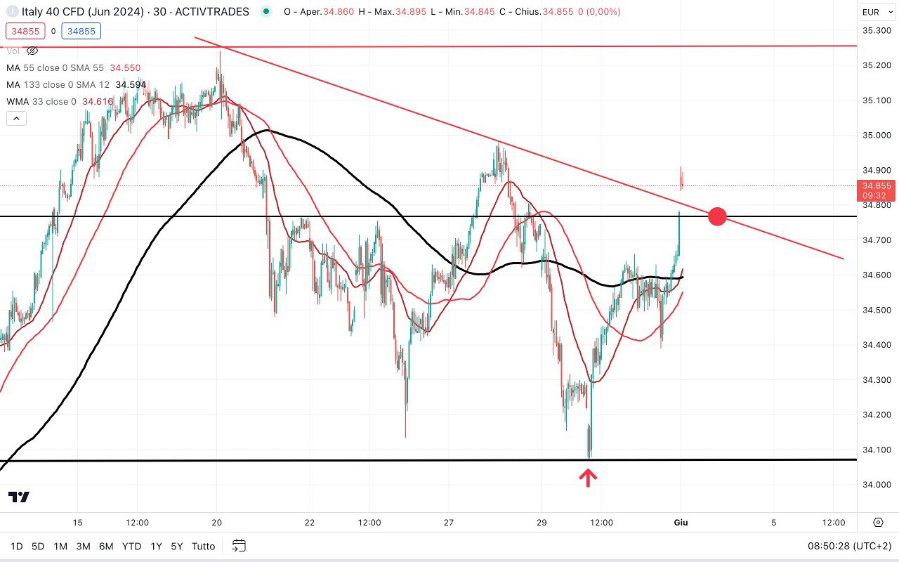 Questa mattina, sulla scia del recupero di Venerdì sera, il MIB ha aperto a 34900 ed ora staziona poco sotto.