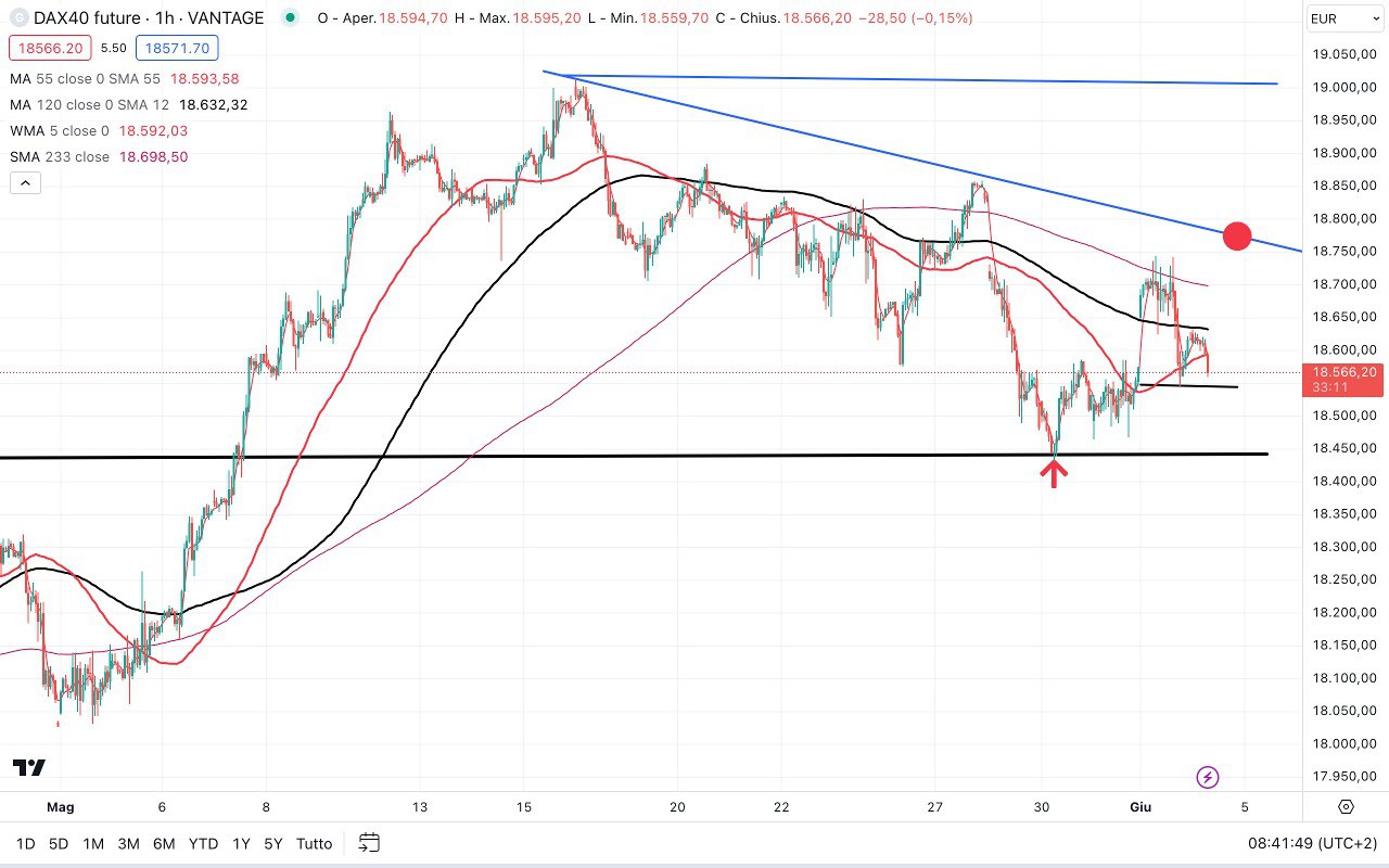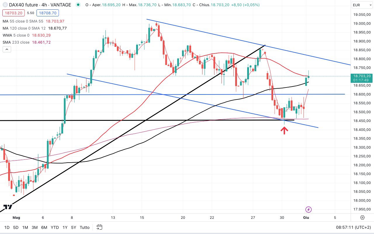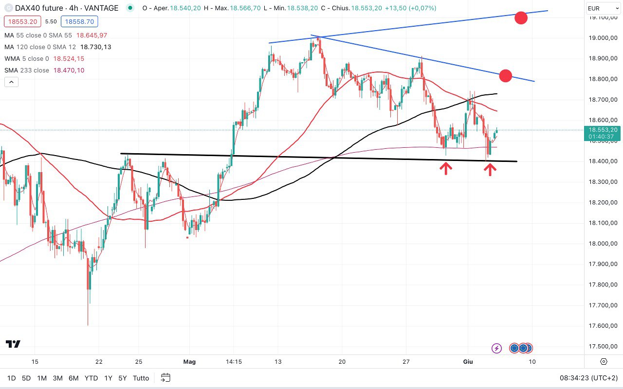 Abbiamo una sorta di DOPPIO MINIMO di breve attorno ai 18400 punti, quindi in prospettiva rialzista se viene superato l’ultimo massimo di breve fatto a 18750 punti circa, il DAX potrebbe anche raggiungere i 19000-19100 punti.