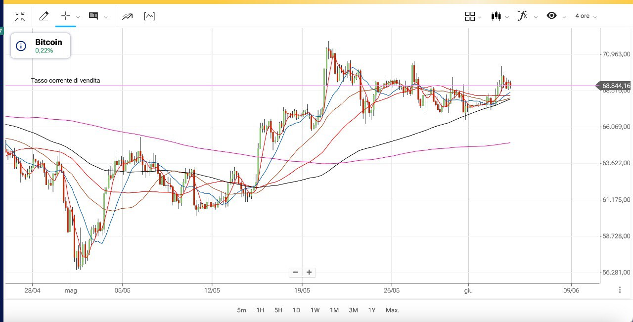 Il BITCOIN ha già fatto un picco ieri a 70000 dollari, mentre oggi oscilla sui 69000 dollari.