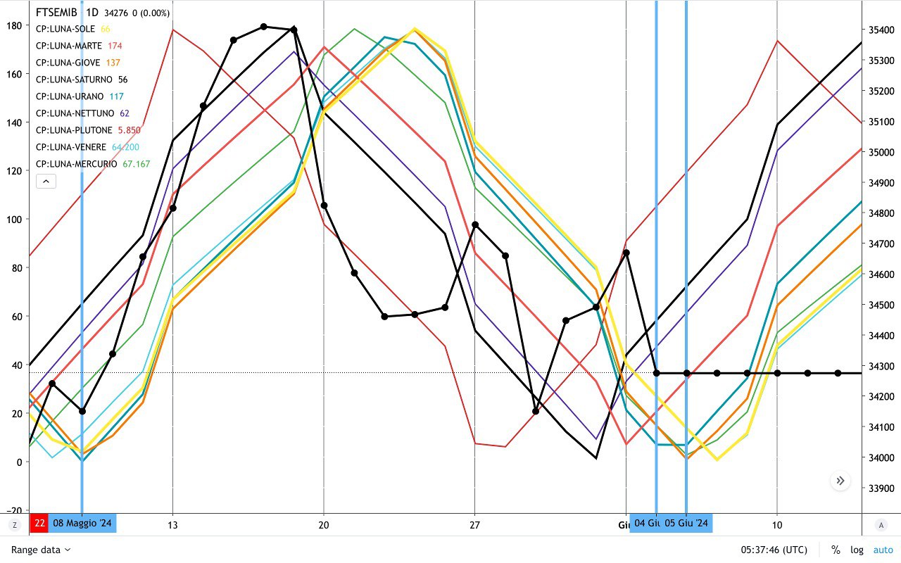 In base alle osservazioni, quando la LUNA va in CONGIUNZIONE a GIOVE è molto probabile un movimento RIALZISTA, come peraltro avvenuto anche nella precedente CONGIUNZIONE del 8 Maggio.