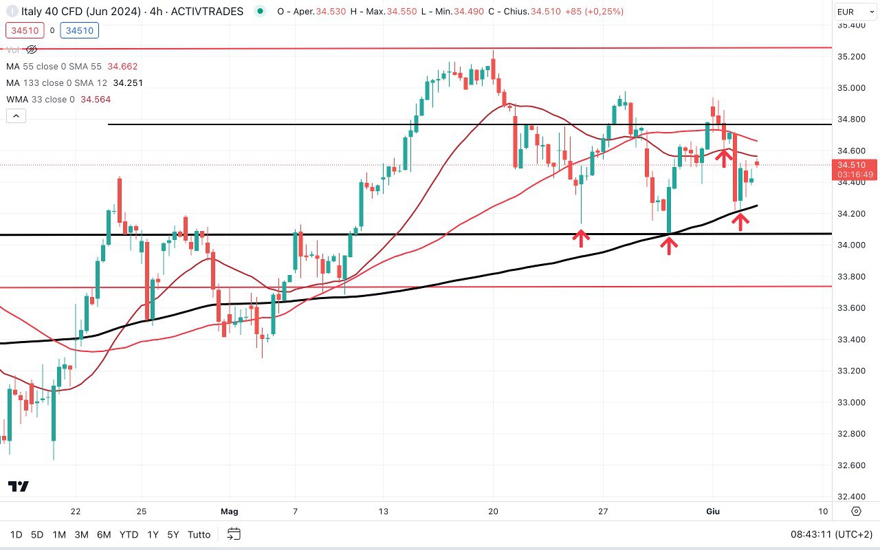 Il MIB ha trovato un SUPPORTO sulla MEDIA MOBILE nera a 120 periodi e stabilito nelle ultime settimane tre MINIMI attorno ai 34100-34200 punti (quello di ieri poco sopra i 34200 punti) e oggi lo troviamo poco sopra i 34500 punti, in prossimità delle prime RESISTENZE.