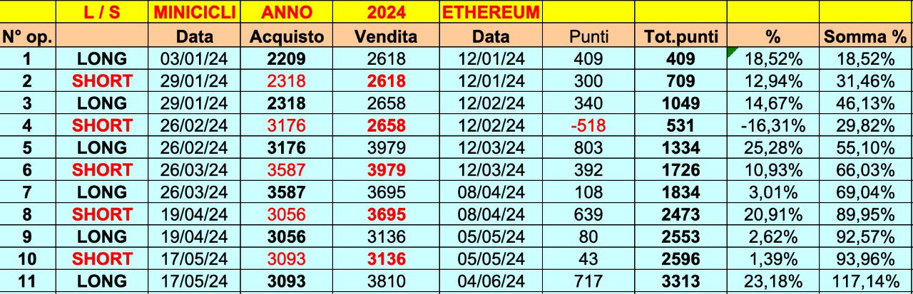 Sta di fatto che la performance dei MINICICLI su ETHEREUM è davvero impressionante, con 10 ONDE POSITIVE su 11 e + 115% in meno di 6 mesi.