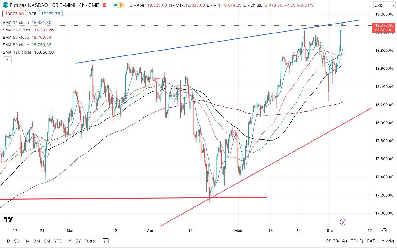 Grande accelerazione rialzista ieri sul NASDAQ 100, che ha toccato i 19100 punti.