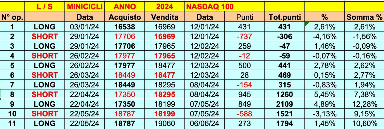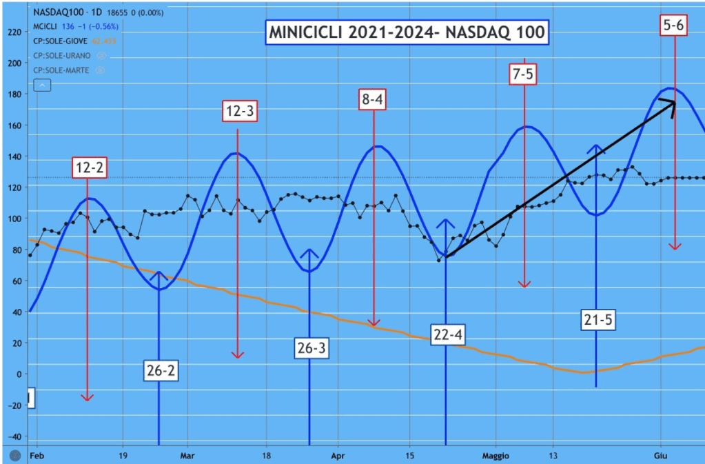 Abbiamo osservato, nell’ultimo periodo, che tra gli INDICI di BORSA è il NASDAQ 100 americano ad avere la migliore correlazione con i MINICICLI.