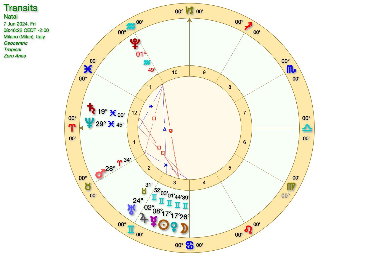 In questo caso la LUNA ha già formato una CONGIUNZIONE con URANO e oggi avremo appunto la CONGIUNZIONE con GIOVE e MERCURIO.