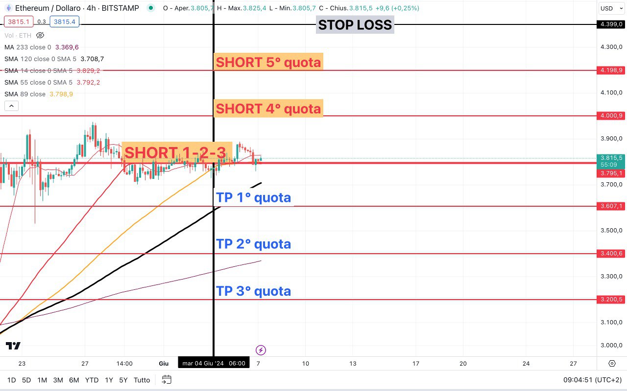 In merito alle STRATEGIE SHORT su ETHEREUM, come mostrato ieri, siamo ancora attorno ai 3800 dollari, quindi più o meno al punto di partenza….