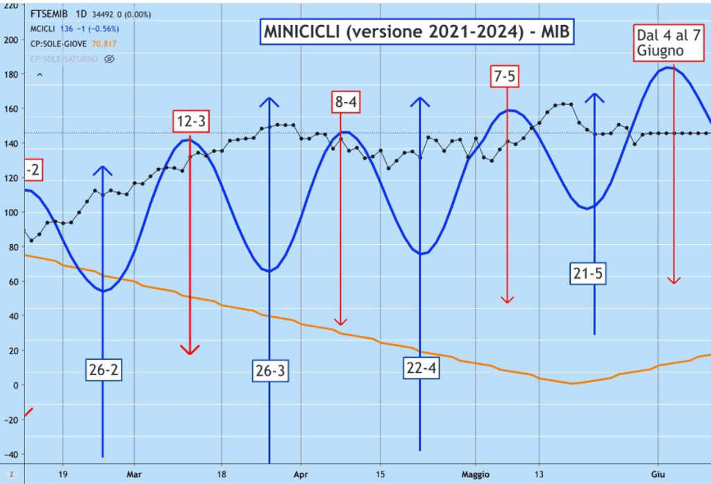 L’ONDA dei MINICICLI è al RIALZO. e nel grafico vedete la FINESTRA TEMPORALE di INVERSIONE dal 4 al 7 Giugno (n pratica tutta la settimana) dopodichè avremo un’ONDA al RIBASSO fino al … (la data è conosciuta in anticipo dagli ABBONATI).
