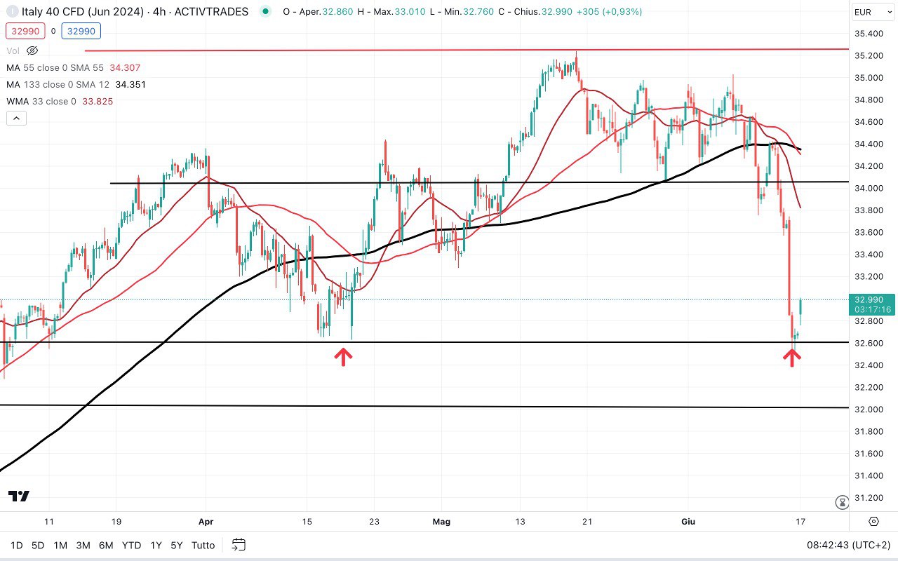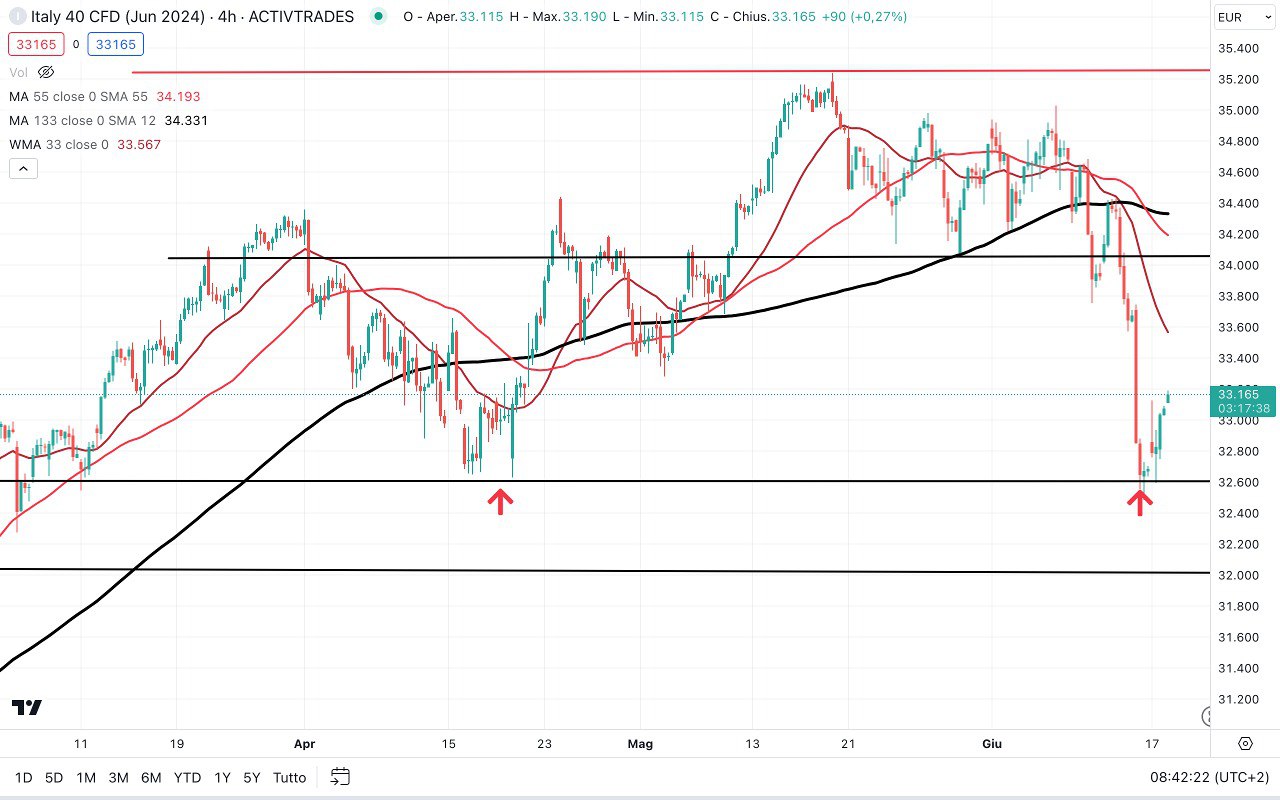 Il MIB sta già rimbalzando di quasi 700 punti rispetto ai MINIMI di Venerdì (ci troviamo ora attorno ai 33150-33200 punti).