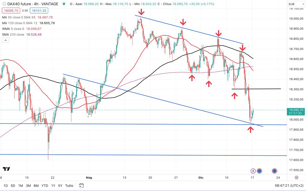 Sul DAX future il MINIMO è stato attorno ai 18000 punti, mentre ora stiamo tornando verso i 18100 punti.