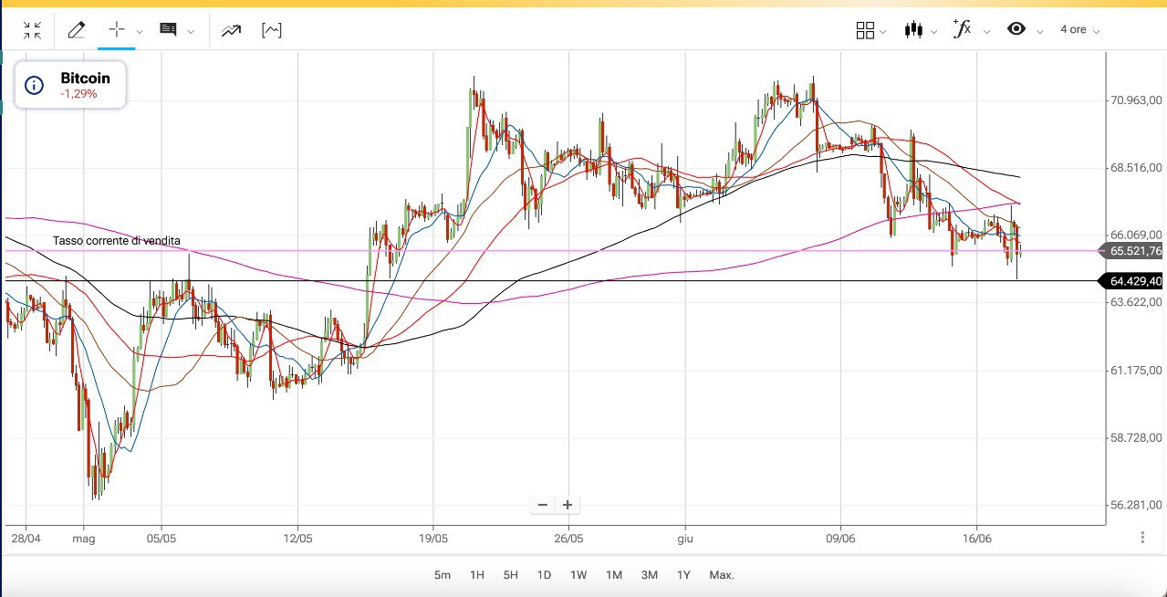Il BITCOIN ieri ha fatto un massimo a 66000 dollari e poi è sceso fino agli attuali 64500 dollari.