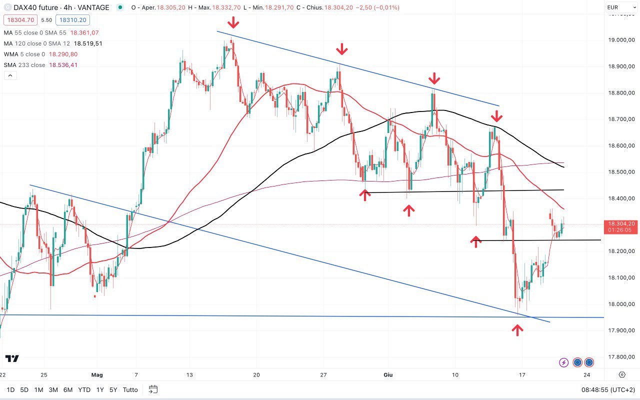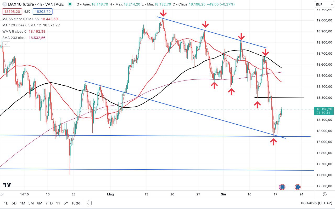 Sotto il DAX, che dai MINIMI poco sotto i 18000 punti, si trova ora attorno ai 18200 punti.