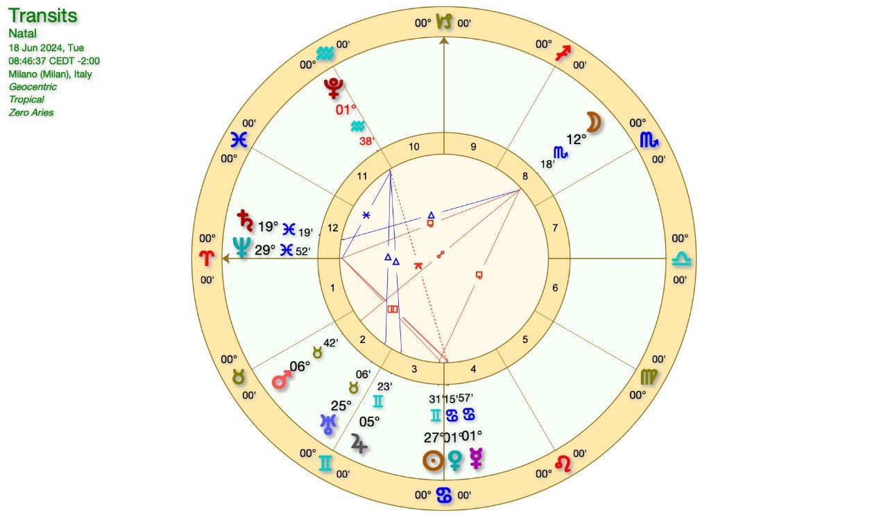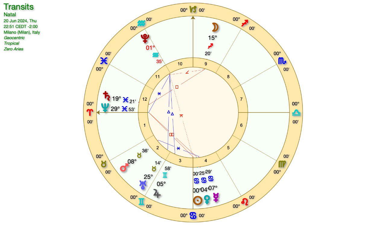 Un’occhiata al grafico astrologico perchè già in serata avremo il SOLSTIZIO d’ESTATE, vale a dire l’ingresso del SOLE nel SEGNO del CANCRO.