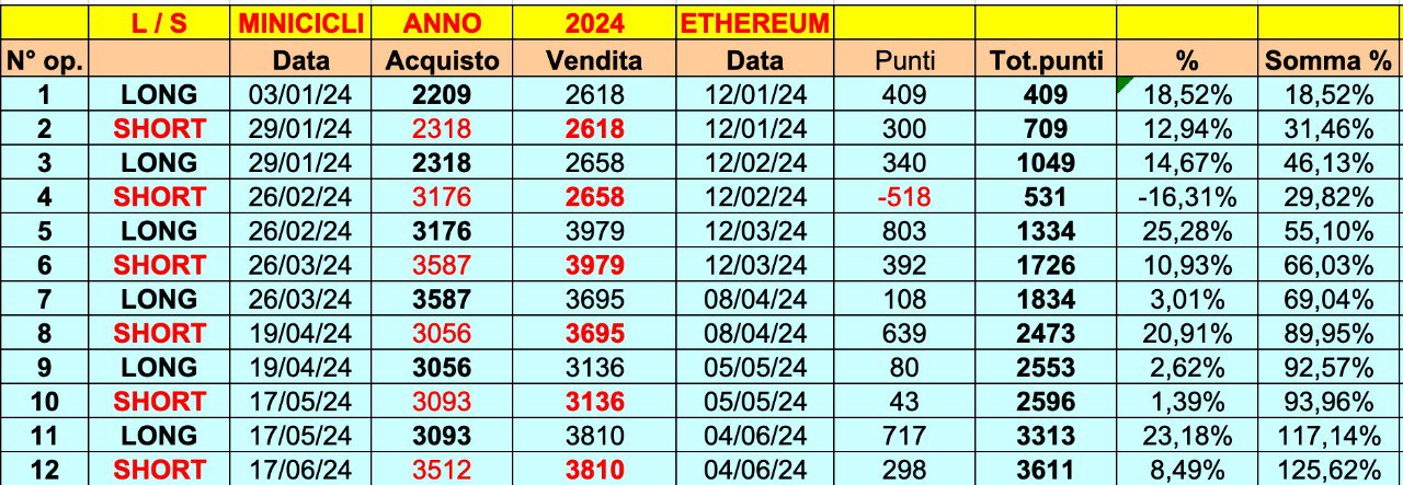 Il RISULTATO dei MINICICLI su ETHEREUM, come detto, è davvero straordinario, con ben 11 ONDE POSITIVE su 12 e con un +125% in meno di 6 mesi e +3800 punti/dollari (pari a 1 ETHEREUM intero).