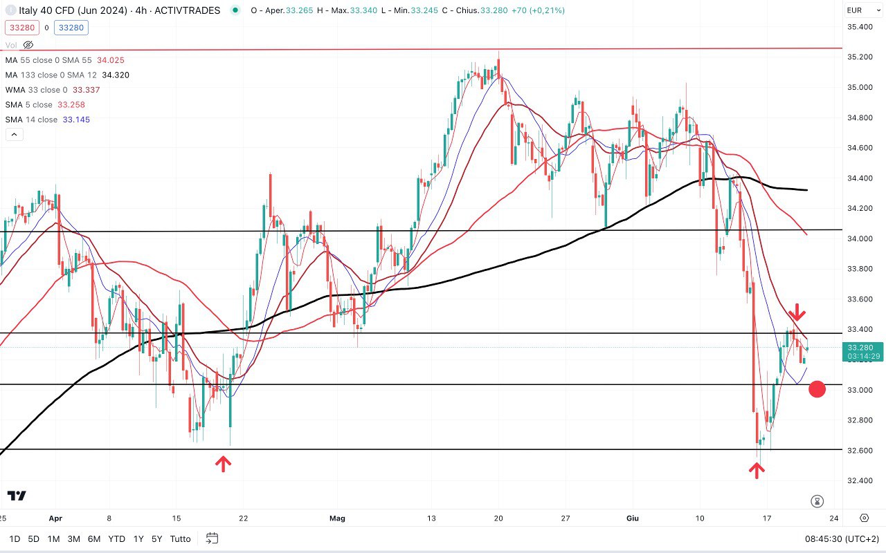Qui siamo ancora sul FUTURE scadenza GIUGNO, che più o meno ha lo stesso valore dell’INDICE e dove in caso di ritracciamento potremmo arrivare verso i 33000-33100 punti, mentre ora siamo attorno ai 33250 punti.