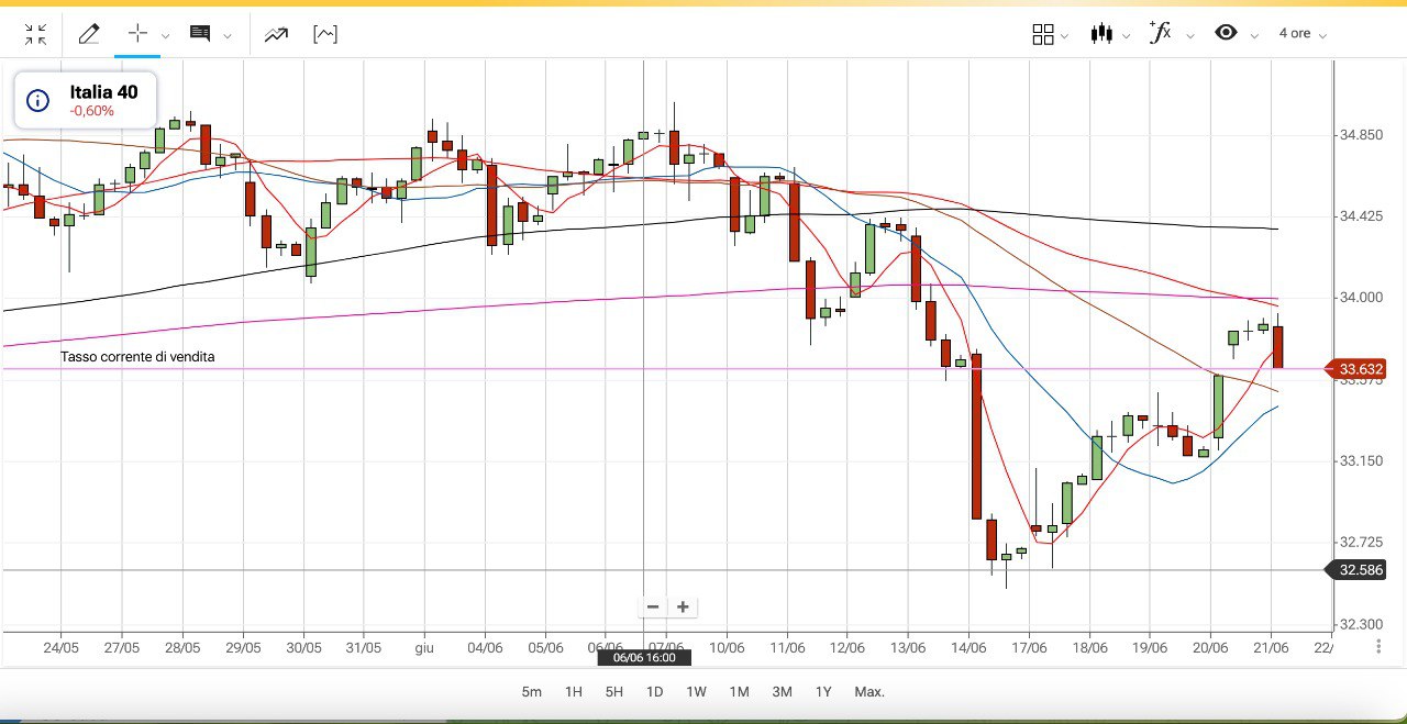 In pratica i valori di fine giornata del 19 Giugno (data teorica di inversione) erano i 33220 punti di indice FTSE MIB, che corrispondono indicativamente ai 33400 punti circa di FUTURE che potrebbe essere quindi un livello ottimale.