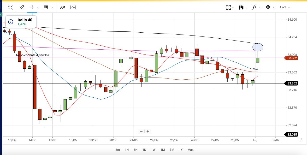 In pratica è stata appena “ritestata” la MEDIA MOBILE a 233 periodi e siamo ora attorno ai 33800-33850 punti.