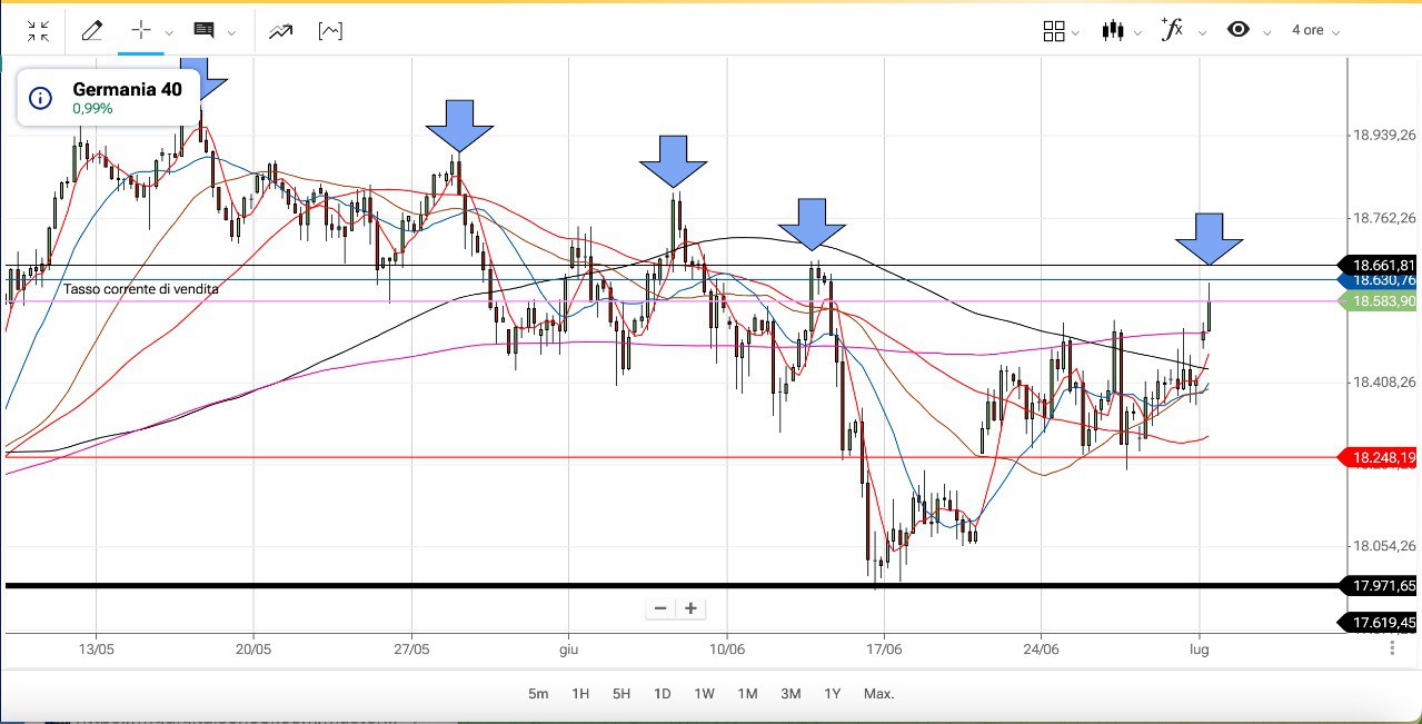 Un’occhiata anche al DAX, ritornato in apertura sopra i 18600 punti ed ora di poco sotto.