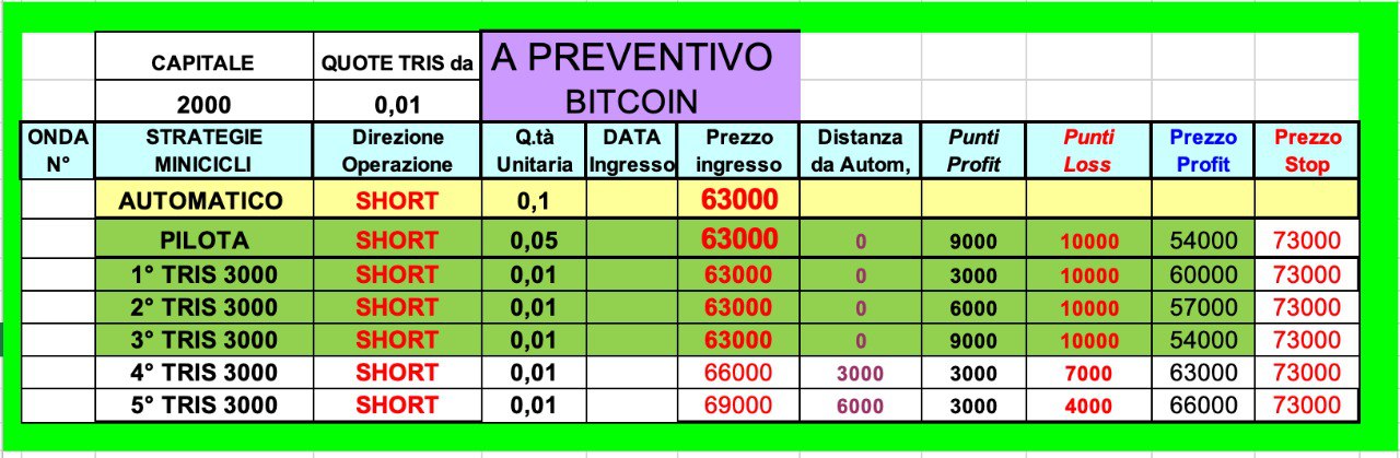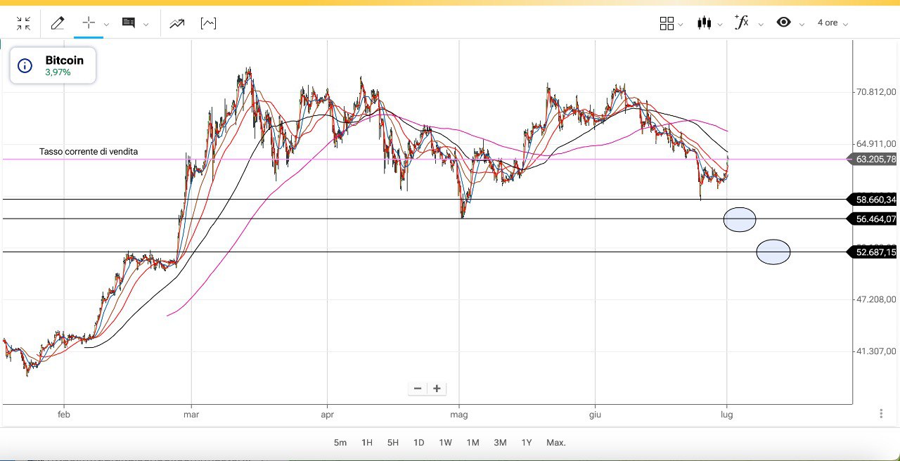 Lo scenario è già stato delineato, con la possibilità che in caso di nuovo affondo verso il basso si possa scendere sotto il MINIMO di inizio MAGGIO fatto attorno ai 56500 dollari.