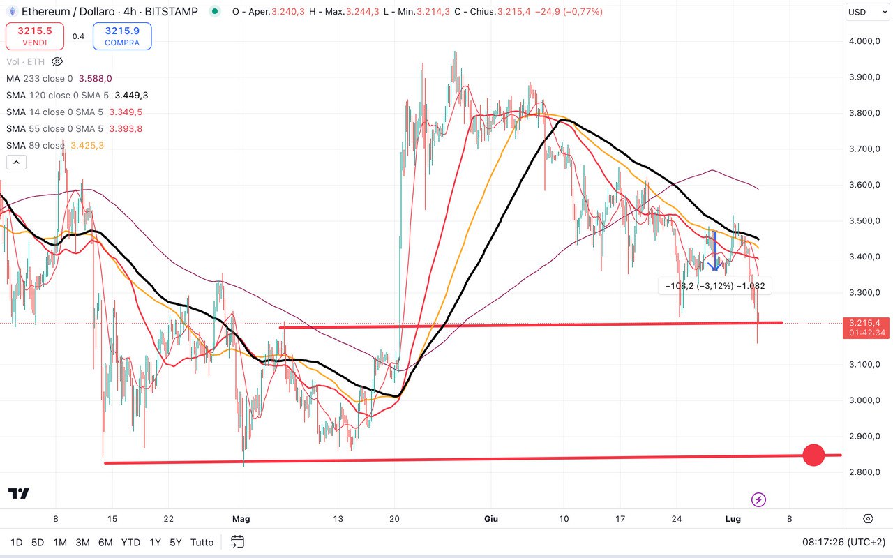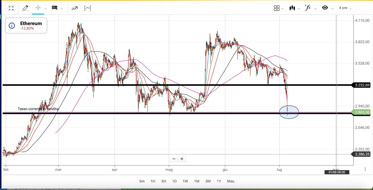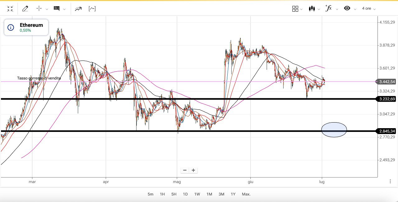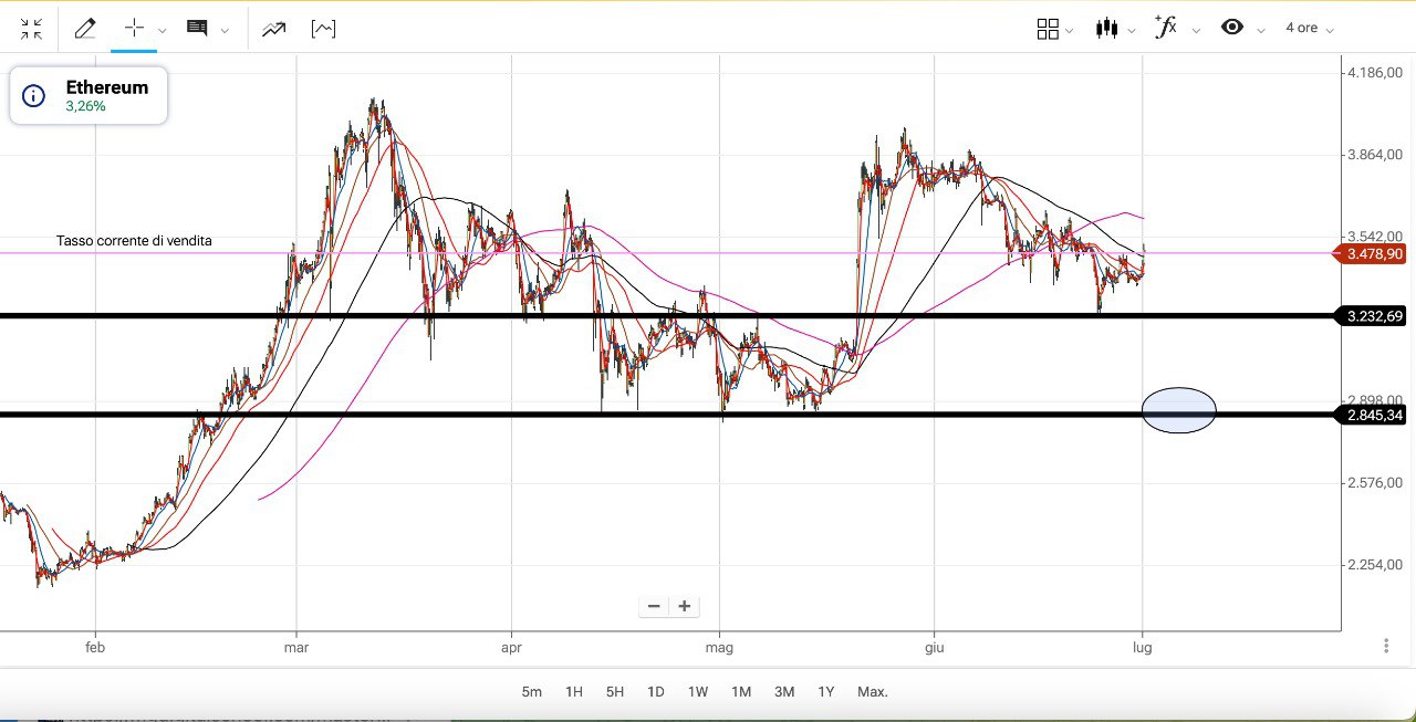 Una cosa simile su ETHEREUM, ritornato ora attorno ai 3500 dollari ma con prospettiva di discesa sotto il MINIMO fatto a 3200 dollari il 24 Giugno.