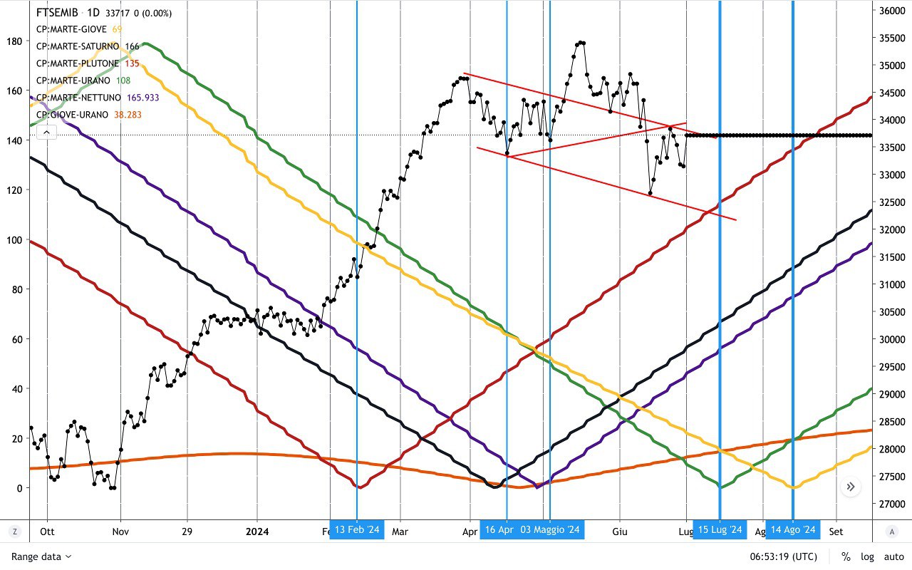 Non vi è molto da aggiungere perchè lo scenario è già stato delineato, quindi non resta che attendere gli eventi ed in particolare l’evoluzione dei mercati da qui a metà LUGLIO quando avremo l’importante CONGIUNZIONE MARTE-URANO a 26° del TORO, che qui sotto rivediamo sul GIAN TRADER.