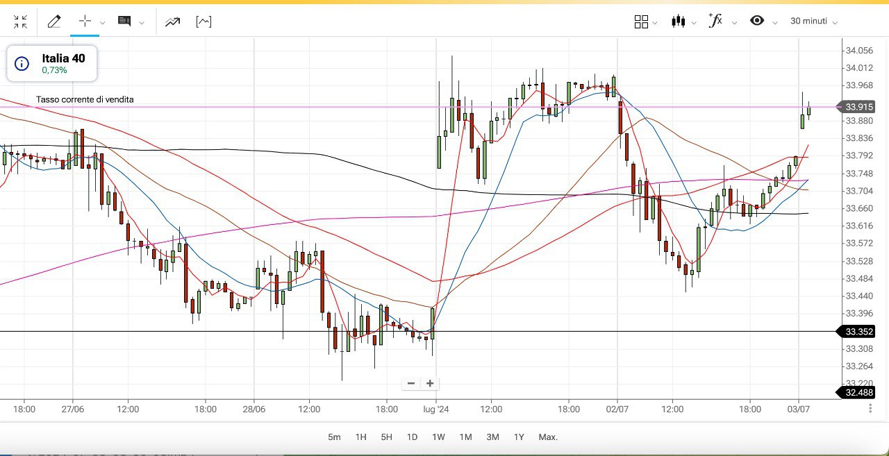 L’affondo ribassista di ieri pomeriggio si è fermato poco sopra i 33400 punti e da lì è partita una nuova spinta verso l’alto con ritorno sui 33900-34000 punti dove ci troviamo ora.