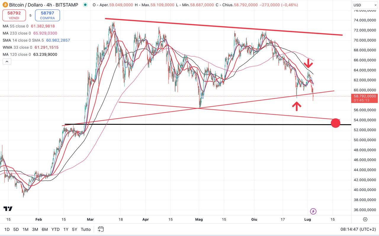 BITCOIN è infatti sceso sotto il MINIMO del 24 Giugno e si trova ora sotto i 59000 dollari.