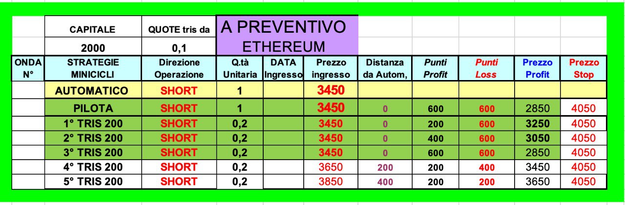 Dai 3450 dollari iniziali in fatti ETHEREUM ha già toccato i 2850 dollari, facendo scattare il profit del PILOTA (600 dollari) e delle QUOTE di TRIS.