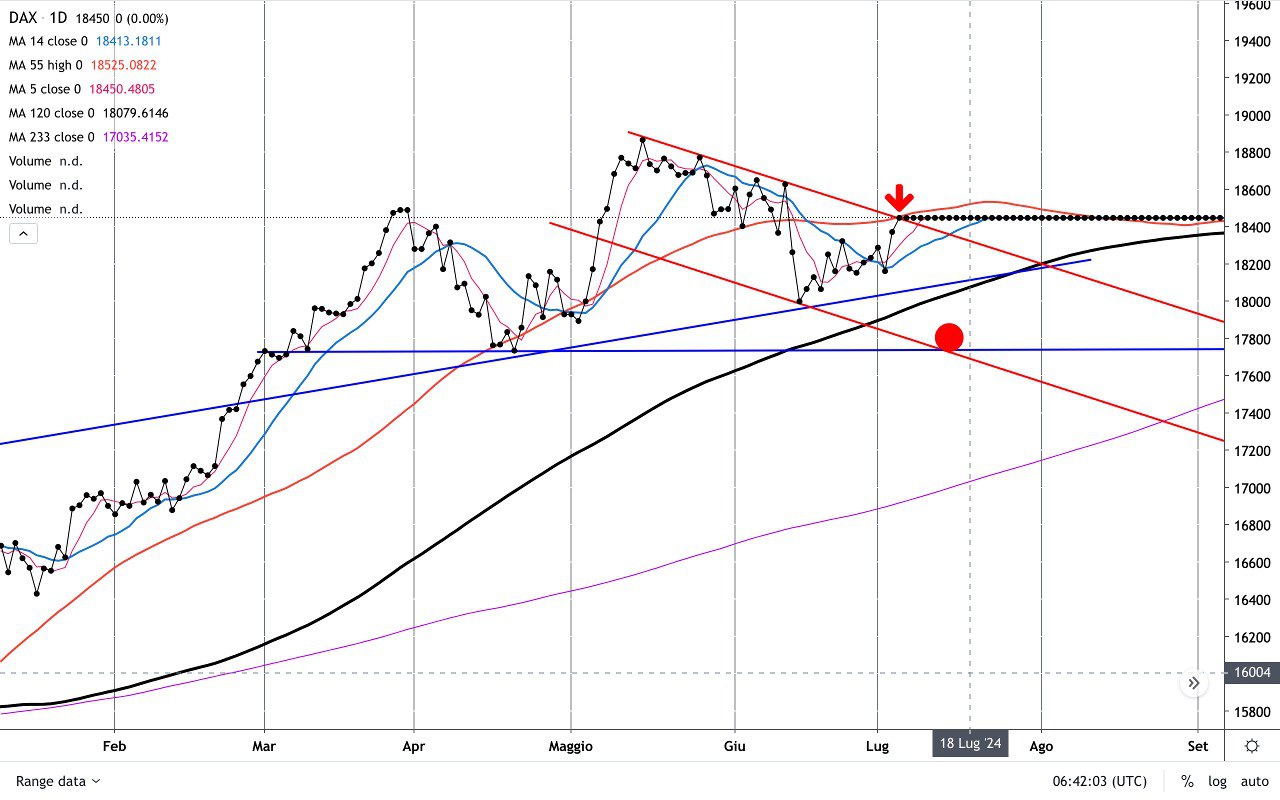 Anche qui siamo teoricamente su una RESISTENZA, in prossimità della MEDIA MOBILE a 55 giorni e della TRENDLINE discendente degli ultimi massimi.