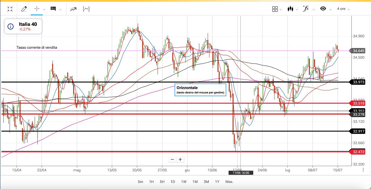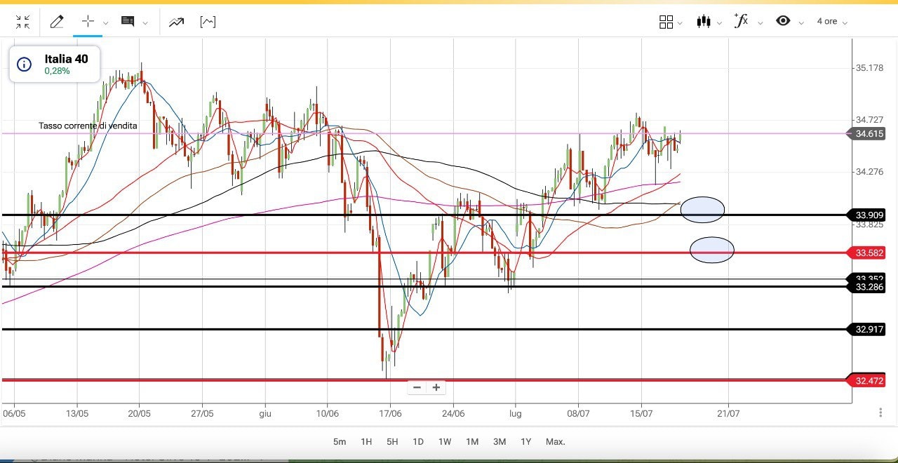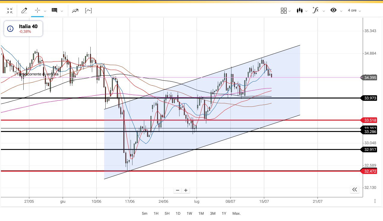 Sappiamo che un primo obiettivo ribassista in caso di discesa si troverebbe attorno ai 34000 punti ma abbiamo anche già analizzato uno SCENARIO più ampio con orizzonte temporale da qui a metà Agosto.