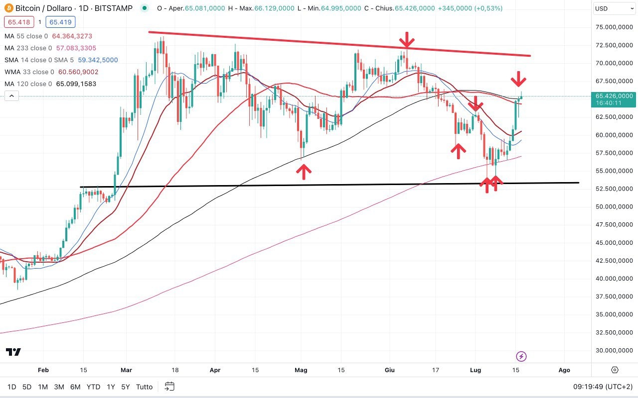 Ora il prezzo è tornato a 63000 dollari, in prossimità della MEDIA MOBILE a 233 periodi.