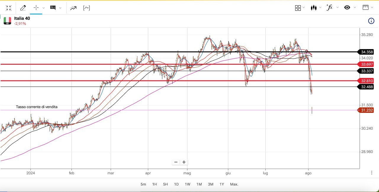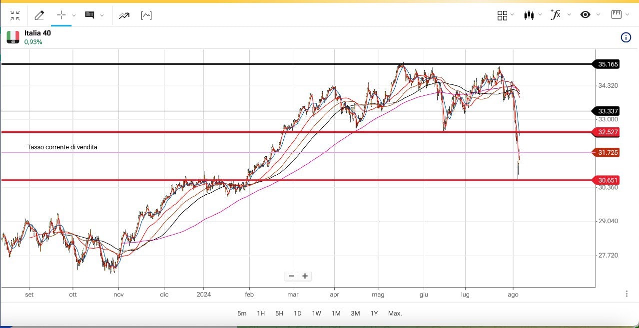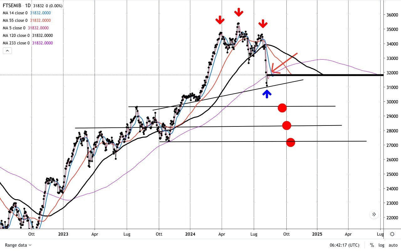 Qualora dunque non si tornasse stabilmente sopra la MEDIA MOBILE a 233 giorni, il quadro resterebbe negativo con i potenziali obiettivi indicati nel grafico (primo obiettivo a 29500 punti circa, in corrispondenza del precedente massimo del Luglio 2023).