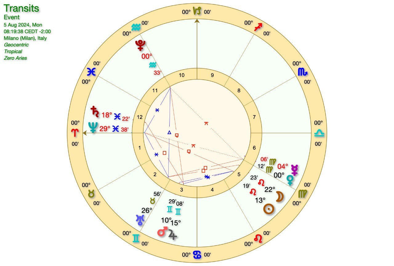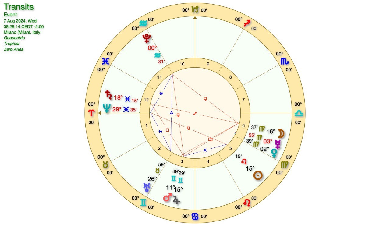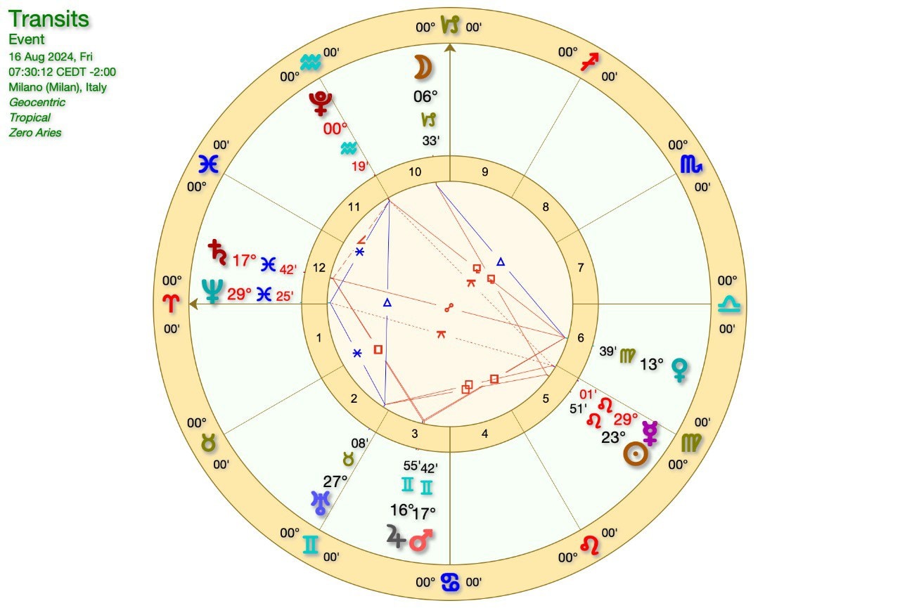 Questo intanto è il grafico della QUADRATURA MARTE-SATURNO del giorno 16 Agosto, a cui seguirà la QUADRATURA GIOVE-SATURNO il 19 Agosto