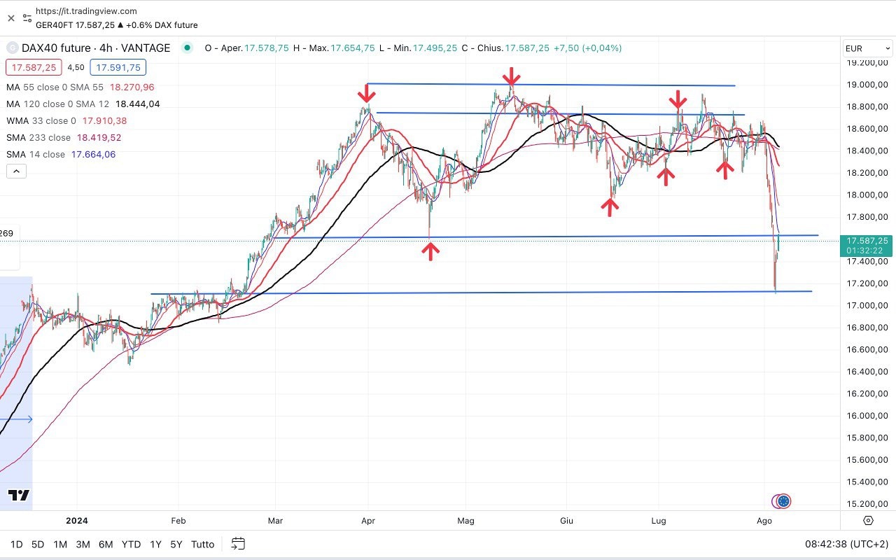 Il DAX future sta esattamente testando dal basso i 17600-17650 punti dopo averli bucati nella giornata di ieri.