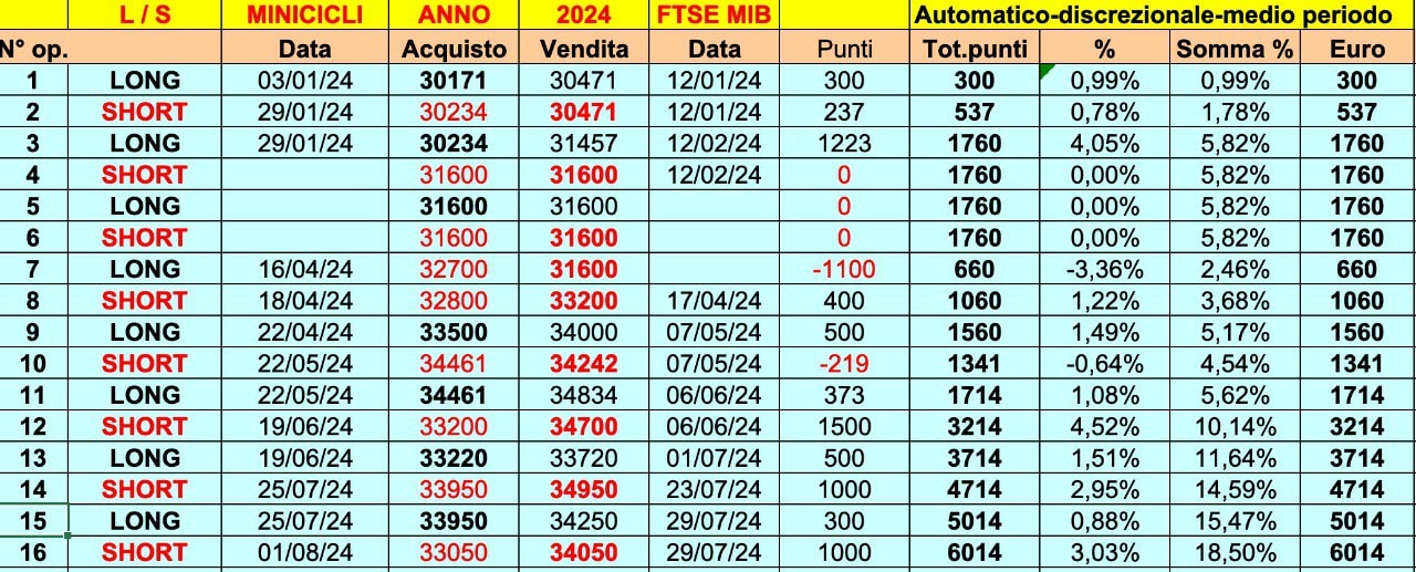 Dal punto di vista operativo, in riferimento al MIB italiano, siamo riusciti a ribaltare il primo trimestre negativo (legato all’operazione di MEDIO PERIODO), con uno spettacolare recupero negli ultimi 3 mesi, portando il risultato sopra i 6000 punti (grazie ai 1000 punti presi la settimana scorsa).