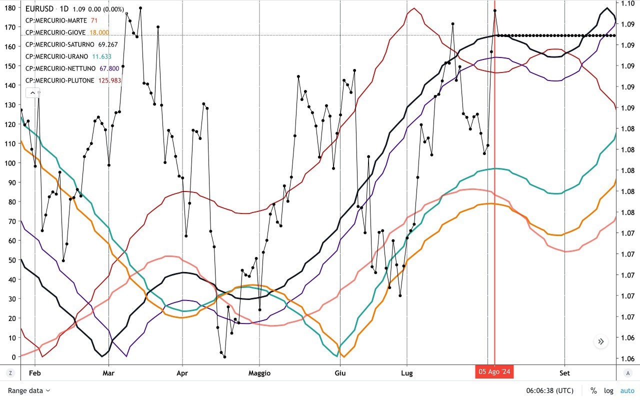Nel frattempo però abbiamo un ELEMENTO interessante da considerare, vale a dire la RETROGRAZIONE di MERCURIO (dal 5 Agosto) che qui sotto vediamo sull’EURODOLLARO.