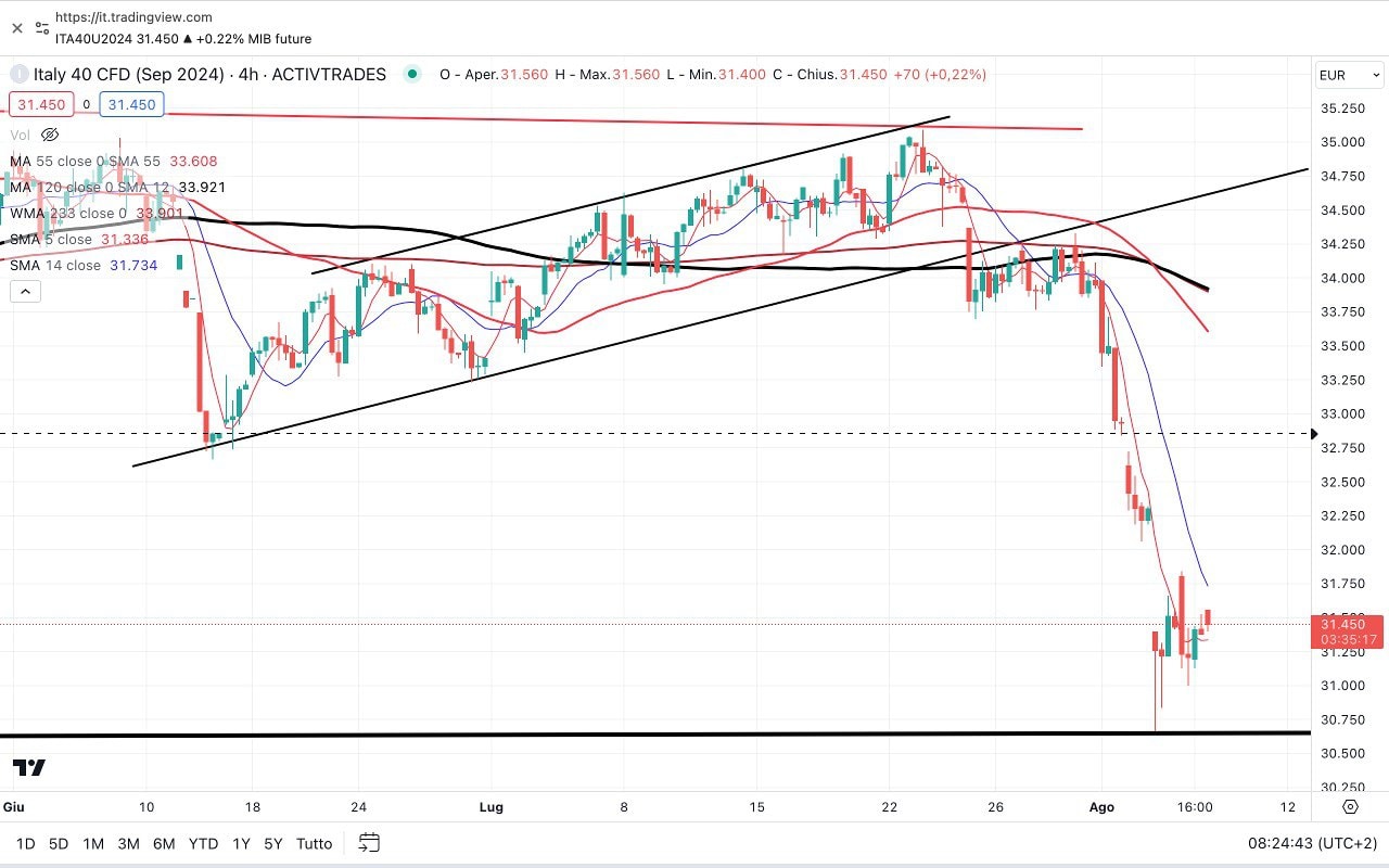 Il MIB future ieri ha fatto un MINIMO davvero profondo, ritornando sui livelli di Gennaio 2024, attorno ai 30700 punti.