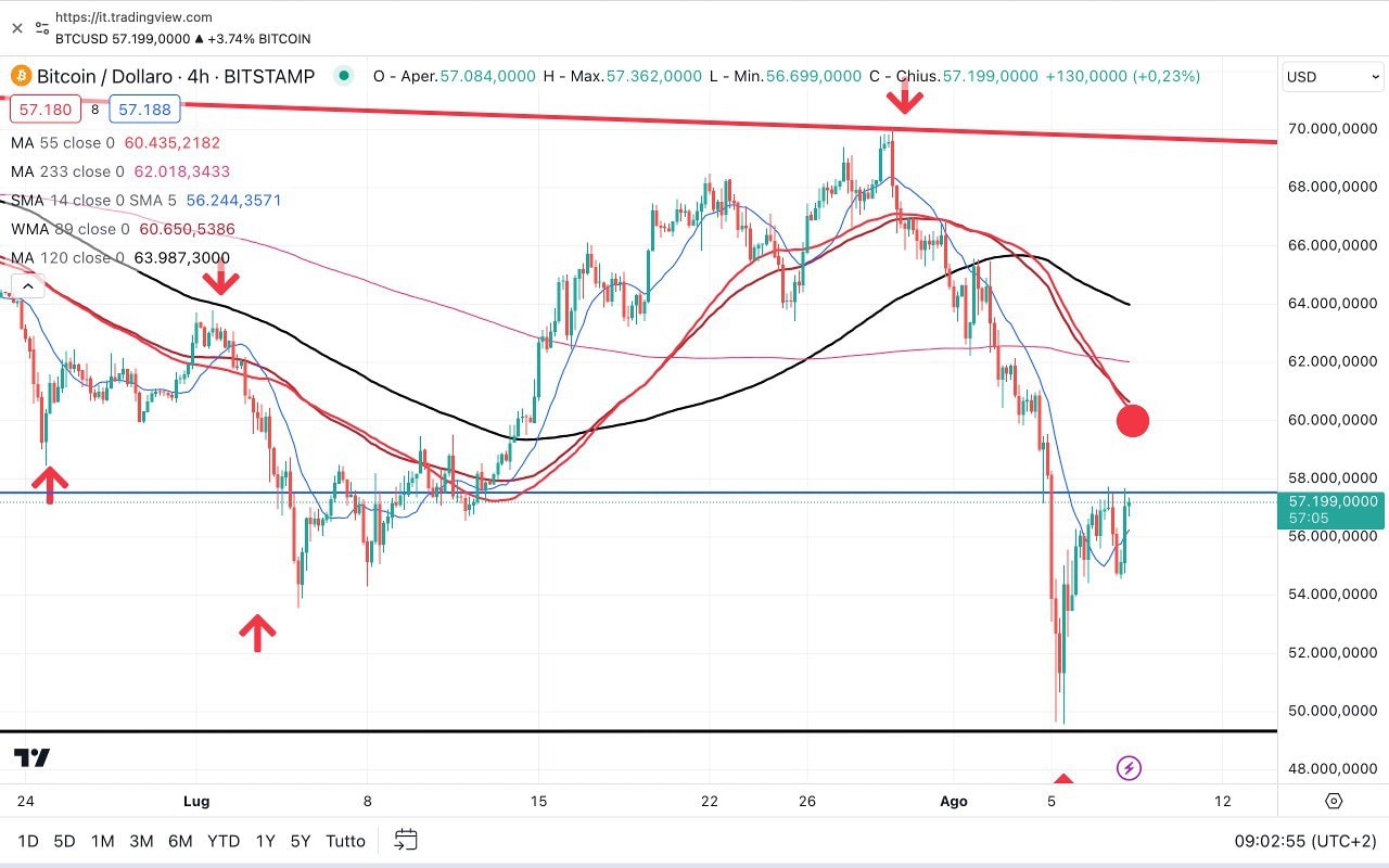Ora stiamo assistendo ad un rimbalzo verso i 56000 dollari.