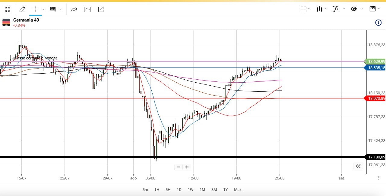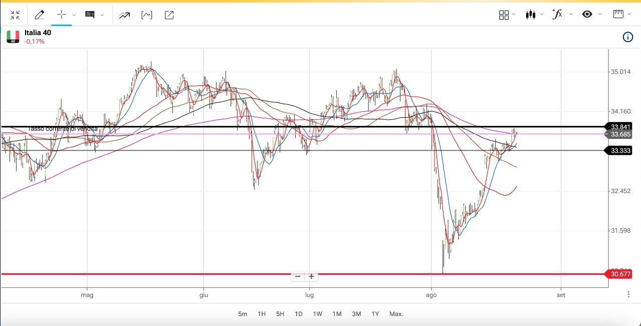 Il MIB si trova ora poco sotto i 33700 punti mentre il DAX è poco sopra i 18600 punti.