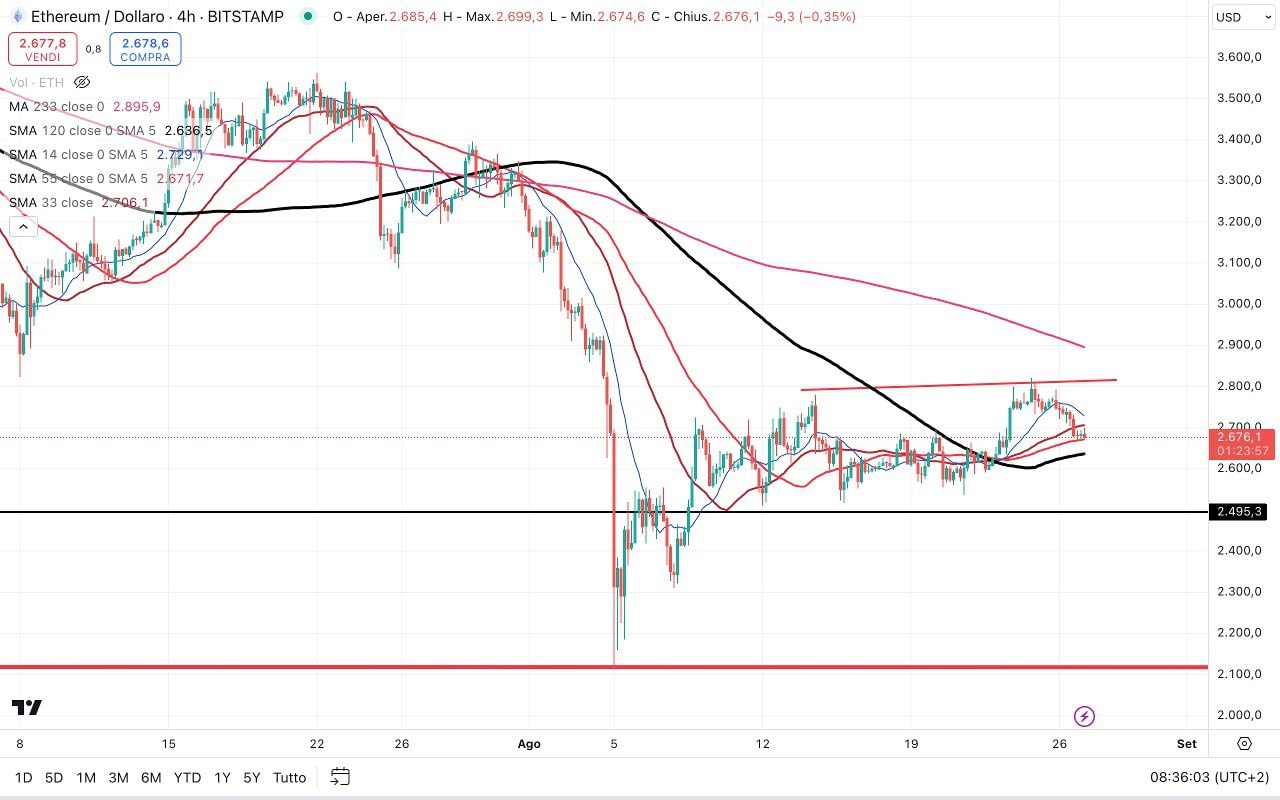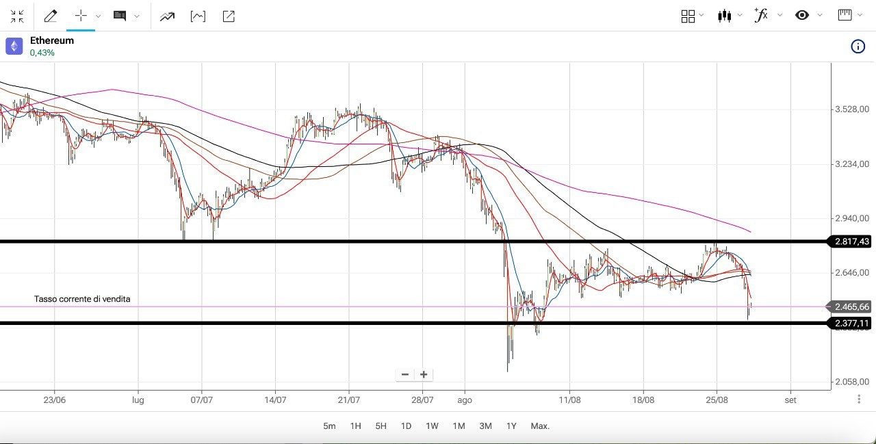 Nella giornata di Venerdì 22 Agosto si era verificata una “sparata” verso l’alto, con ETHEREUM che era tornato sopra i 2800 dollari (una sorta di doppio massimo), mentre ora siamo scesi nuovamente sotto i 2700 dollari.