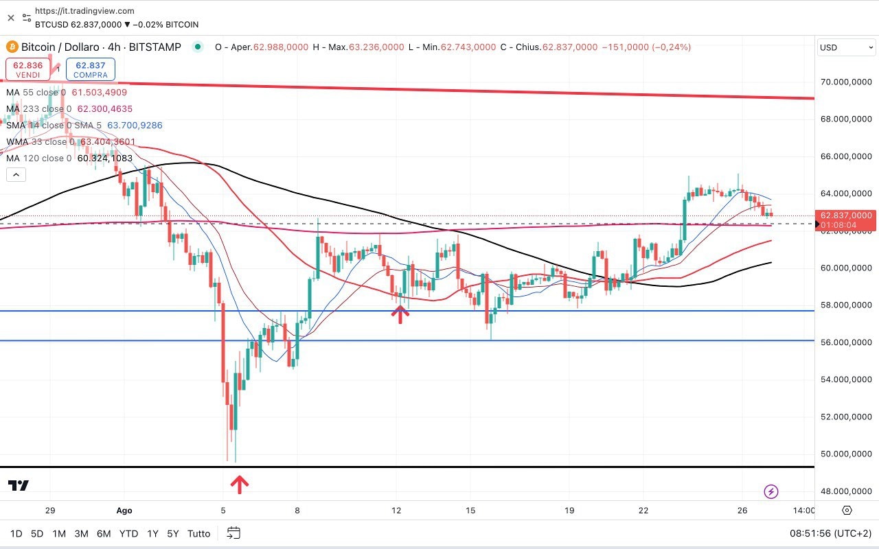 Nel fine settimana il BITCOIN è salito ulteriormente ed ora si trova tra i 63500 e i 64000 dollari (qui è stata fatta la PRE-INVERSIONE al RIBASSO).