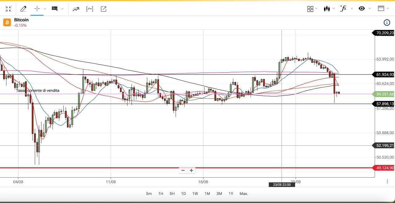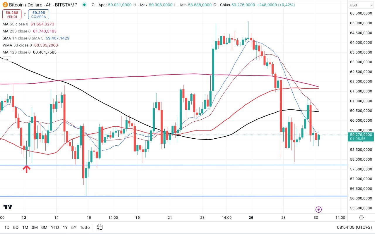 l prezzo è arrivato a toccare la soglia dei 59000 dollari, mentre ora siamo attorno ai 59300-59400 dollari.