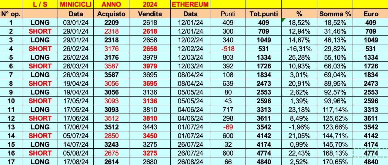E’ opportuno ribadire che ETHEREUM ha dimostrato di essere il mercato più profittevole nella STORIA (ventennale) dei MINICICLI, con perfomances percentuali mai viste prima del 2021, quando abbiamo iniziato a tenere monitorate le correlazioni….