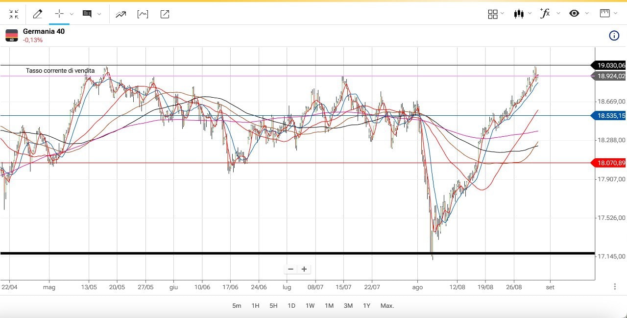 In merito al DAX (sotto) è stato fatto un potenziale doppio massimo poco sopra i 19000 punti.